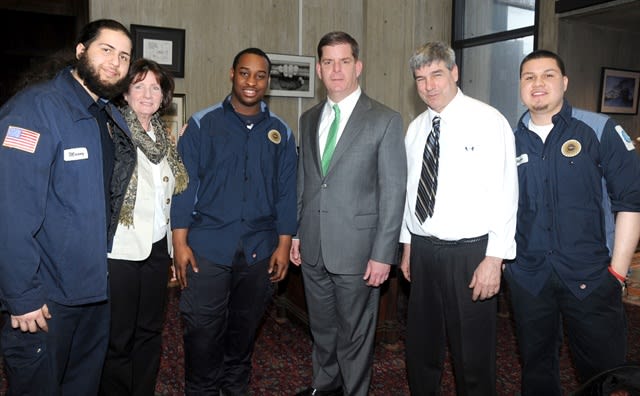 Boston's fleet internship program has been a success, resulting in two technician hires so far and praise from the mayor. Pictured l-r are: Emmanuel Estremera, former intern and now full-time fleet employee; Susan Lambert, cooperative educational coordinator from Madison Park Vocational High School; Junior Cherenfant, current intern from Madison Park; Boston Mayor Martin Walsh; Tom Rafferty, automotive instructor, Madison Park; and Hector Ramirez intern from Madison Park.