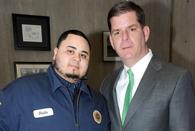 Pablo Guerrero, former intern from Ben Franklin Technical Insittute, is pictured here with Boston Mayor Martin Walsh. Guerrero is now a full-time Boston fleet technician. Photo courtesy of City of Boston