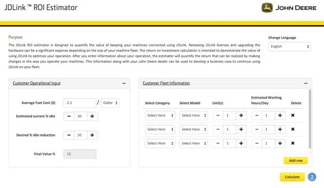 Using the new tool is easy. Customers visit roicalculator.deere.com and fill in the customer operational input functions, including average fuel cost, estimated idle time percentage, and desired idle time percentage; from there, a final value percentage is calculated. Customers then enter their specific fleet information, including models, number of units, and estimated working hours per day. Once all information is entered, the calculate function will quantify the return that can be realized by making changes in the way a customer’s machines are operated. This information along with a John Deere dealer can be used to develop a business case to continue using JDLink.
