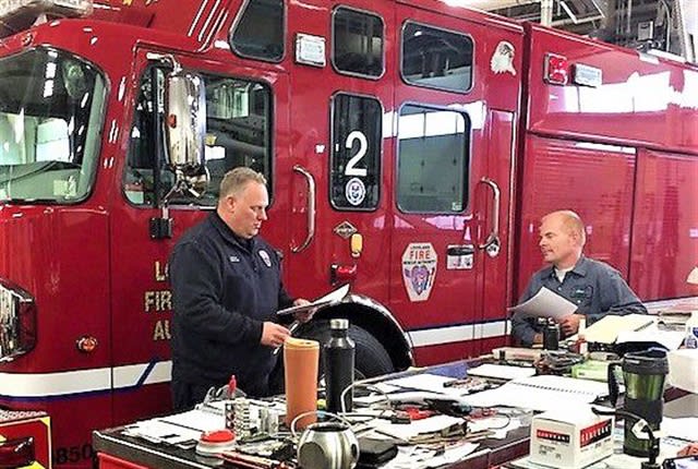 Loveland Fire Rescue Authority Operations Division Chief Greg Ward, left, and Fleet Services Technician Corey Lane go over documentation for a truck in the “heavy fire apparatus” category. Photo via City of Loveland