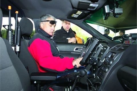 An attendee tries out a police vehicle at the Michigan State Police vehicle testing. Photo: Michigan State Police