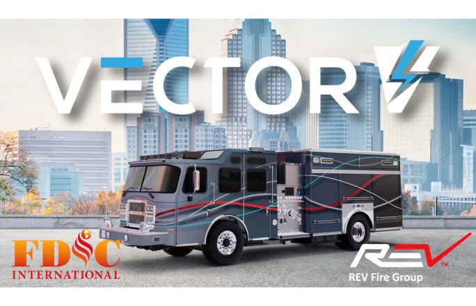 REV Fire Group debuted the Vector electric fire truck at FDIC International in April 2022. Designed with the same components that are used on diesel-driven fire apparatus, Vector’s electric motor takes the place of the diesel engine, driving the pump or the rear axle in normal split shaft operation. Its low center of gravity battery placement provides better cornering with more predictable handling, and is safer in a crash, according to REV's website. The truck will use regenerative breaking to assist with battery charging.