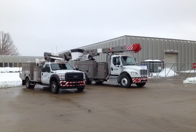 Bucket trucks and other vehicles are inspected to help ensure safe operation during the season. Tires are checked each fall and replaced, if necessary, before winter. Air braking systems also are examined, as moisture in the system can freeze and cause reduced braking efficiency. The diesel fuel used in company vehicles contains a special winter additive that prevents the fuel from gelling in the cold. Trucks are also outfitted with anti-skid materials like sand and salt, and tire chains are inspected and repaired or replaced as needed.