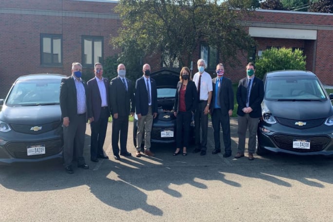 County and State officials stand by the three Chevrolet Bolt electric vehicles that were recently purchased by the County through a New York State Energy Research and Development Authority (NYSERDA) grant.