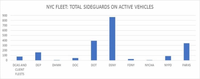 The New York City fleet has installed the 2,000th truck sideguard on city fleet units, with installations continuing weekly. Sideguards have been installed on all Parks, Department of Correction, Department of Health and Mental Hygiene, and Department of Citywide Administrative Services (DCAS) trucks, according to the fleet newsletter. Other departments have sideguards on part of their fleets.