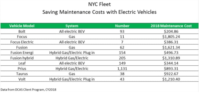 New York City has released preliminary maintenance costs for its electric fleet vehicles in comparison to select gasoline-powered vehicles. All-electric vehicles had the lowest recorded maintenance costs for 2018, dramatically less than gasoline, hybrid, or hybrid-plug-in models.