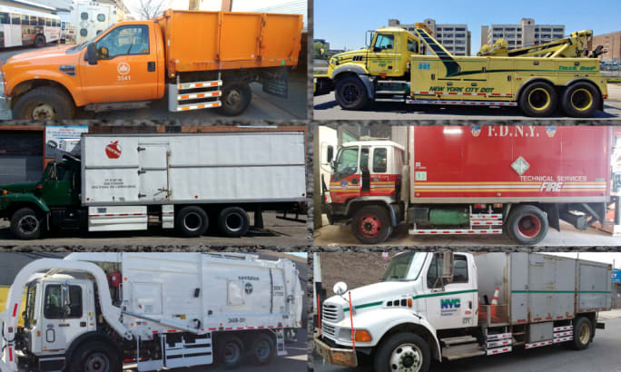 NYC's side guard law extends to large trucks within the city fleet, as well as certain contracted trucks. Several fleet vehicles are seen here with side guards installed.