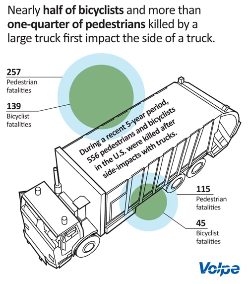 In 2016, the U.S. DOT Volpe National Transportation Systems Center reported that during a recent five-year period, 556 pedestrians and bicyclists in the U.S. were killed after side-impacts with trucks.