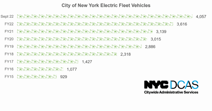 New York City's electric vehicle fleet consists of 4,057 electric vehicles as of September 22, 2022.