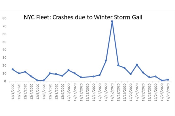 New York City’s mid-December snowstorm, Gail, led to a significant increase in fleet crashes and injuries. The city saw 600% increase in crashes on the day of the storm, the New York City’s Citywide Administrative Services reported in its fleet newsletter.