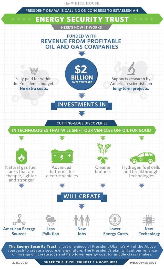 The $2 billion in the Trust would fund research on a range of alternative-fuel transportation technologies, including vehicles that run on electricity, biofuels, fuel cells, and natural gas. The President’s proposal also calls on Congress to set a goal of cutting U.S. net oil imports by half (compared to 2008 levels) by 2020.
