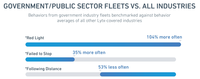 Lytx compared the prevalence of behaviors seen in public-sector fleets against behavior averages of fleets across all of its other protected industries. Comparatively, public-sector fleets stood out in the following areas:
