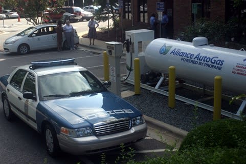 One of the dual-fuel Ford Crown Victorias next to the newly installed fueling station.