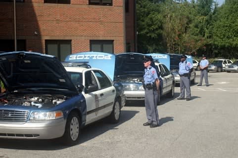 Officers stand during the ceremony where the Raleigh Police Department received the converted Crown Victorias.