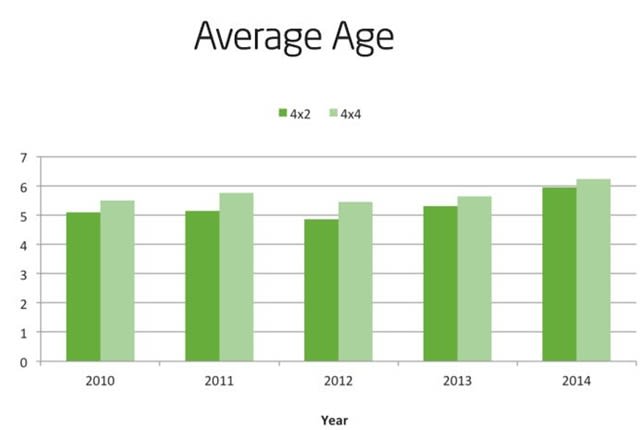 Utilimarc has released a benchmarking study for compact SUVs showing that its utility and municipal fleet clients' average vehicle ages have risen in the past five years. The average age for 4×2 compact SUVs increased by 0.85 years from 2010 and 2014, while the 4×4 increased by 0.74 years from 2010 to 2014. The average age historically for the 4×2 is 5.26 years, and the average for the 4×4 is 5.72.