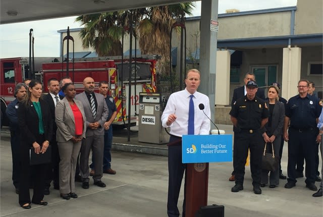Mayor Kevin L. Faulconer announced the switch to renewable diesel at a press conference. Photo courtesy of the City of San Diego