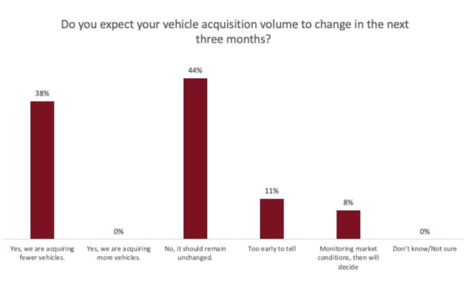 As for short-term acquisition plans, 38% said they plan acquire fewer vehicles in the next three months, while none said they plan to acquire more vehicles during this time period.