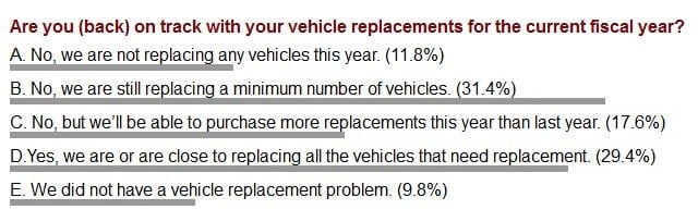 A January online poll conducted by Government Fleet Magazine asking about vehicle replacement funds found that most fleets are still having problems with replacing vehicles. The nonscientific poll, which had 51 responses, shows that 12% of respondents are not replacing vehicles this fiscal year; 49% will be able to replace some vehicles, but they are are not back on track with replacements. In comparison, 29% said they are close to replacing all the vehicles that need to be cycled out, and 10% said they did not have a replacement problem.