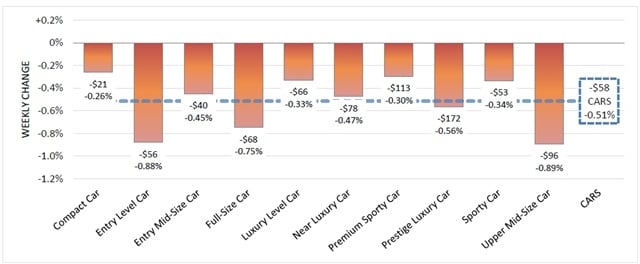 Overall, the volume-weighted car values decreased by 0.51 percent for the week ending Sept. 22. This is the highest depreciation rate seen since the third week of July, according to Black Book. Segments that suffered the largest depreciation last week include Upper Mid-Size Car, Entry Level Car and Full-Size Car with declines of minus 0.89 percent, minus 0.88 percent, and minus 0.75 percent respectively.