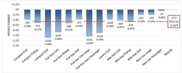Overall, the volume-weighted truck values decreased by 0.46 percent this past week. This is the largest truck segment depreciation rate seen since October 2014, according to Black Book. Compact SUV, Full-Size Cargo Van and Full-Size Passenger Vans saw depreciation greater than 1 percent. Mid-Size SUV, Mini Van Cargo and Mini Van Passenger experienced only small decreases in value.