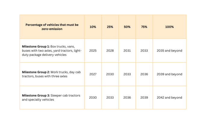 ZEV Milestones Option (Optional): Instead of the Model Year Schedule, fleets may elect to meet ZEV targets as a percentage of the total fleet starting with vehicle types that are most suitable for electrification. That schedule is included in the table below.