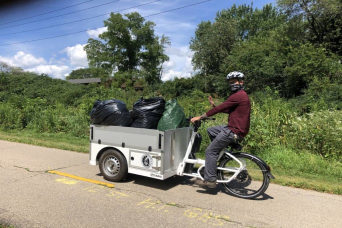 The bike was trialed first by the City of Madison’s Fleet Services to move parts between locations. The City Engineering Department’s Greenway Vegetation Program has begun to use them as well. “The cargo bike has been great for hauling equipment and brush as we do vegetation maintenance along city bike paths and at ponds and greenways. COVID safety restrictions have eliminated vehicle sharing, so the cargo bike has the added bonus of allowing us to get an employee to a site with needed tools and equipment without having to use a personal vehicle,” said Madeline Dumas, greenway vegetation coordinator.