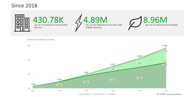 Additionally, it has reduced 4.89 million lbs. of CO2 through its electric and hybrid vehicles, as well as 8.96 million lbs. of CO2 through biodiesel-fueled vehicles.