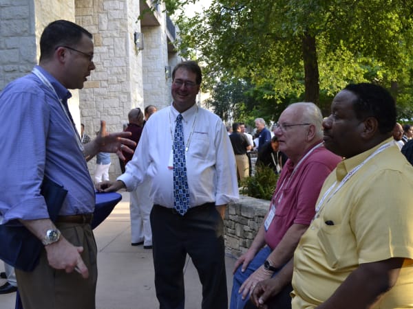 Larry Campbell of Fort Wayne, Ind., talks to colleagues and a Faster representative on the show floor.