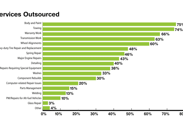 Fleet managers balance the work they do in-house with the staff they have with work that is more time-consuming, specialized, or requires special tools or equipment that they outsource. This chart shows the most commonly outsourced services. Responses in the “Other” category include upholstery work, police upfitting, and biocleaning.