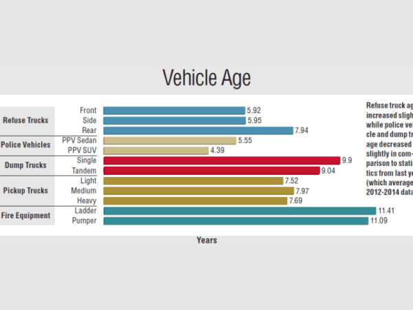 Refuse truck age increased slightly while police vehicles and dump truck age decreased slightly in comparison to statistics from last year (which averaged 2012-2014 data).