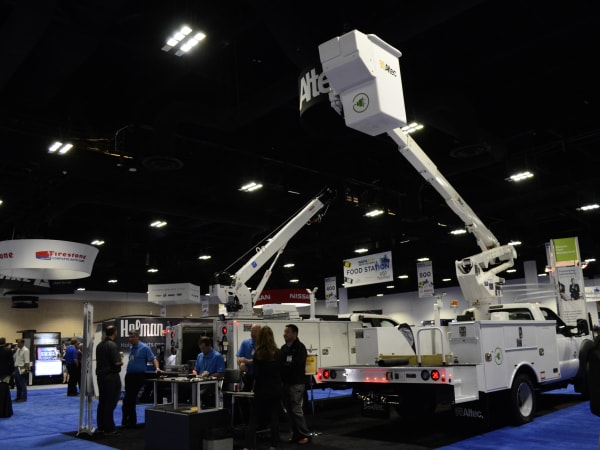 Altec's booth featured its fiberglass mechanics truck (left) and AT40G JEMS 4E4 telescopic articulating aerial device with jobsite energy mangement system (right).