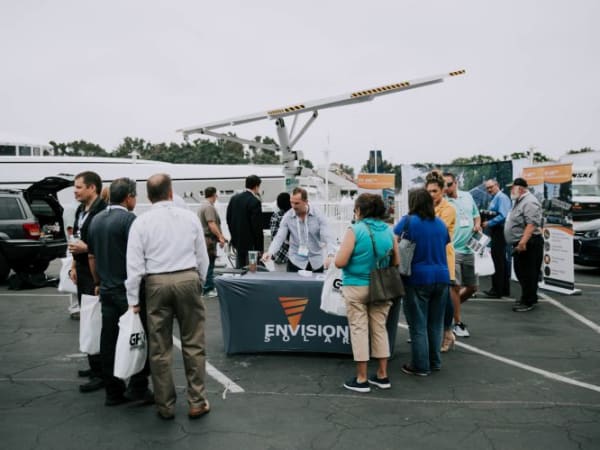 Block Party attendees check out a solar-powered electric vehicle charger from Envision Solar.