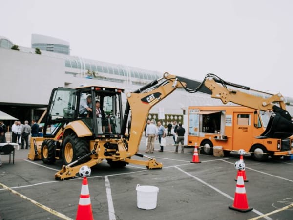 Caterpillar hosted a game, where attendees attempt to pick up a soccer ball and drop it in a basket.