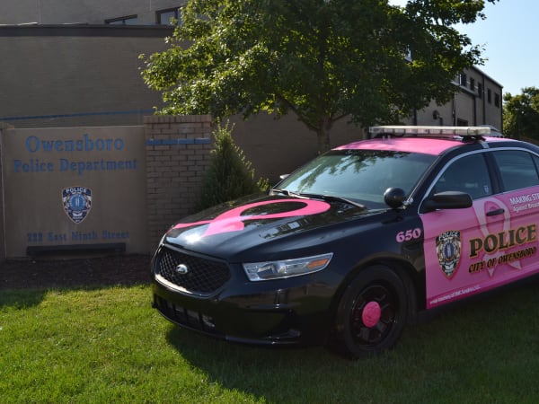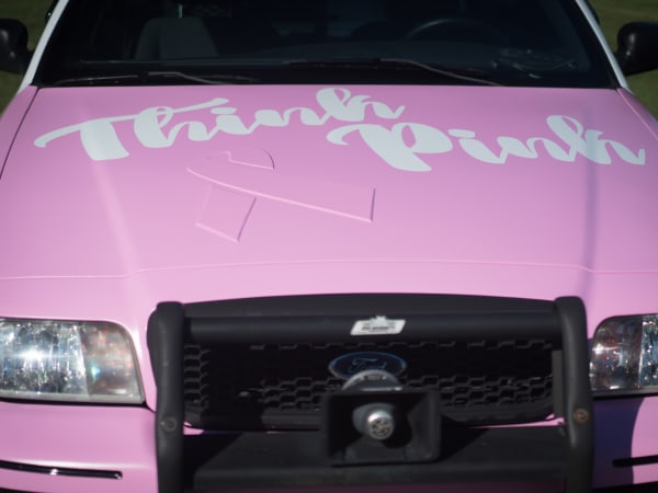 A lieutenant for the Owensboro Police Department in North Carolina partnered with other members of the community for the American Cancer Society's "Real Men Wear Pink" campaign, which seeks to raise funds to support breast cancer research, education, and prevention. A local graphics company donated pink vehicle graphics as part of the campaign. Photo courtesy of Owensboro Police Deparment