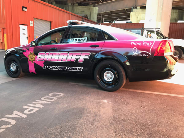 In 2016, the San Joaquin Sheriff's Office in California unveiled this cruiser, a Chevrolet Caprice with a pink and black color scheme. Photo courtesy of Avery Dennison