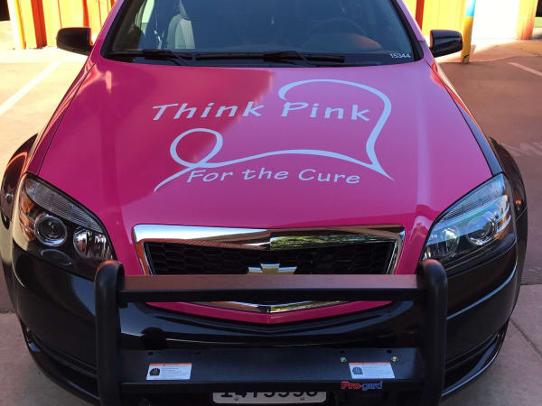 The 2016 cruiser features the "Think Pink" slogan and a white ribbon shaped like a heart. Graphics were installed by Original Mobile Graphics. Photo courtesy of Avery Dennison