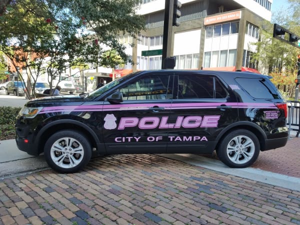 Pink vehicle graphics were sponsord by the Tampa Police Department's police foundation. The foundation is also selling limited-edition challenge coins to raise money for the cause. In addition, Tampa Interim Police Chief Brian Dugan is representing the Police Department in the American Cancer Society's "Real Men Wear Pink" campaign with five other men across the county. Photo courtesy of City of Tampa