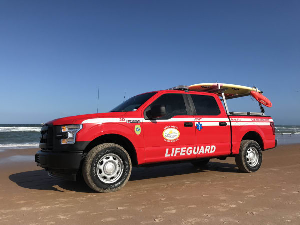 Beach patrol vehicles are equipped with standard and specialized equipment, including light abrs, partitions, surfboard racks, and gun storage boxes. Photo courtesy of Volusia County