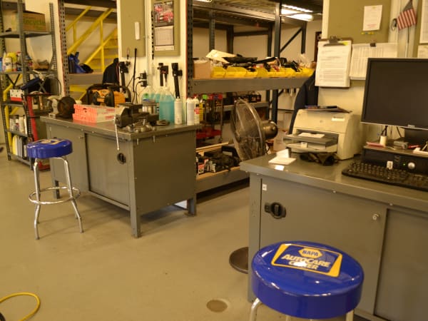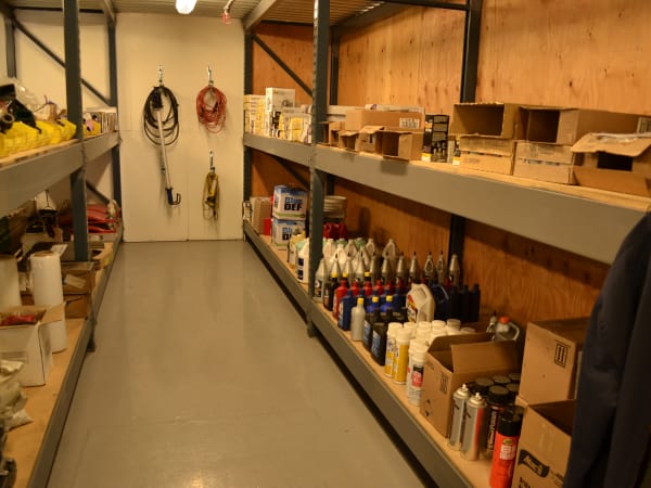 The fleet carries about $7,500 in parts inventory, stored in the pictured parts room.