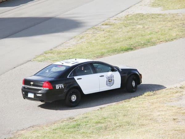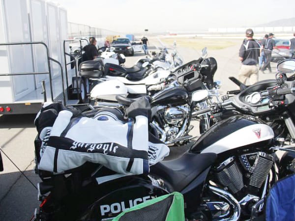 A Dodge Charger Pursuit and Chevrolet Caprice finish their test laps at the same time.