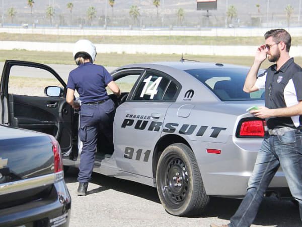A female LAPD vehicle evaluator gets behind the wheel of the AWD V-8 Dodge Charger Pursuit.