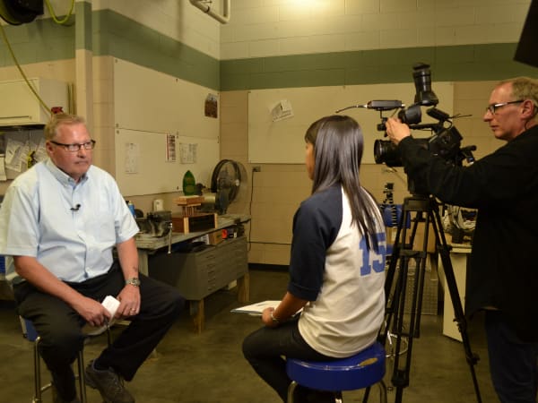 Fleet technicians Mac McKelvy (left) and Eric Dena are working on a Ford Crown Victoria that is being prepared for auction.
