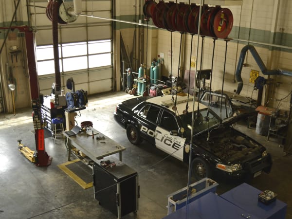 This Ford Police Interceptor sedan is in the shop for a routine service. The Town’s Fleet Service Division maintains and repairs all Police & Fire vehicles, with the exception of the big fire ladder trucks and pumpers.
