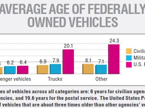 FEDERAL FLEET: The average ages of vehicles across all categories are: 6 years for civilian agencies, 7.5 years for military agencies, and 19.6 years for the postal service. The United States Postal Service fleet consists of vehicles that are about three times older than other agencies’ vehicles. Source: U.S. GSA