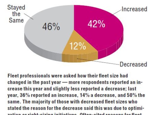 Fleet professionals were asked how their fleet size had changed in the past year — more respondents reported an increase this year and slightly less reported a decrease; last year, 36% reported an increase, 14% a decrease, and 50% the same. The majority of those with decreased fleet sizes who stated the reason for the decrease said this was due to optimization or right-sizing initiatives. Source: GF Industry Trends Survey 2015