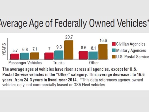 The average ages of vehicles have risen across all agencies, except for U.S. Postal Service vehicles in the "Other" category. This average decreased to 16.6 years, from 24.3 years in fiscal-year 2014. *This data references agency-owned vehicles only, not commercially leased of GSA Fleet vehicles