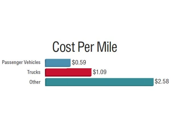 Cost per mile for passenger vehicles and trucks has decreased from 2014, while CPM for "other" vehicles increased from $2.29 in 2014.