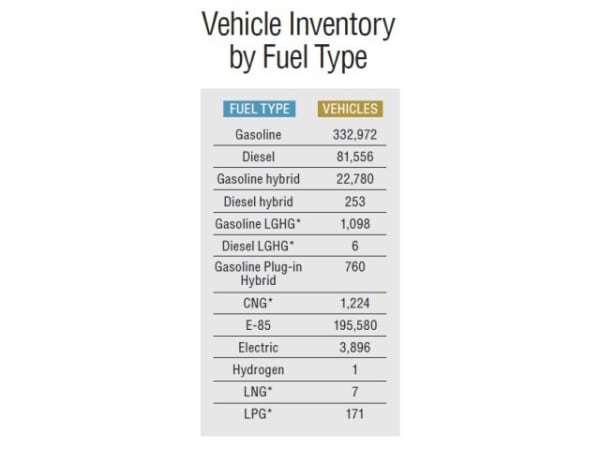Gasoline vehicle totals have decreased by 2% from the previous year, while diesel vehicles have increased by almost 1%. The number of hybrids and flex-fuel vehicles has increased, while the number of CNG and electric vehicles has decreased. *Abbreviations: LGHG - low greenhouse gas; CNG - compressed natural gas; LNG - liquefied natural gas; LPG - Liquefied petroleum gas