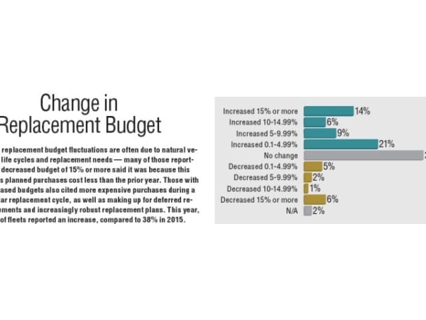 year’s planned purchases cost less than the prior year. Those with increased budgets also cited more expensive purchases during a regular replacement cycle, as well as making up for deferred replacements and increasingly robust replacement plans. This year, 50% of fleets reported an increase, compared to 38% in 2015.
