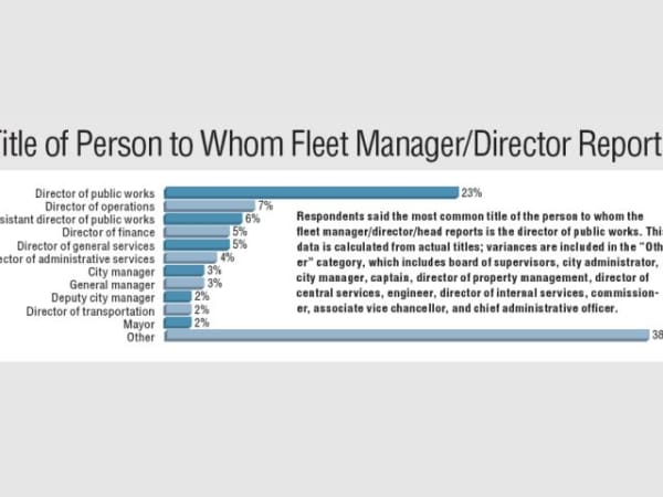 Respondents said the most common title of the person to whom the fleet manager/director/head reports is the director of public works. This data is calculated from actual titles; variances are included in the “Other” category, which includes board of supervisors, city administrator, city manager, captain, director of property management, director of central services, engineer, director of internal services, commissioner, associate vice chancellor, and chief administrative officer.